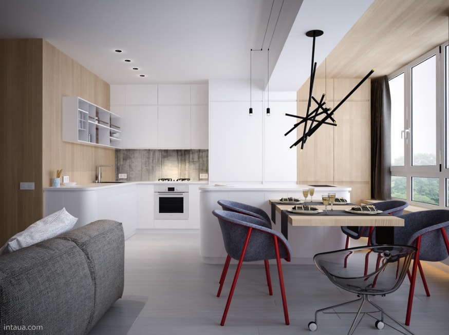 Спокойный, нейтральный дизайн кухни-гостиной дополнен стульями серого цвета с яркими, красными ножками