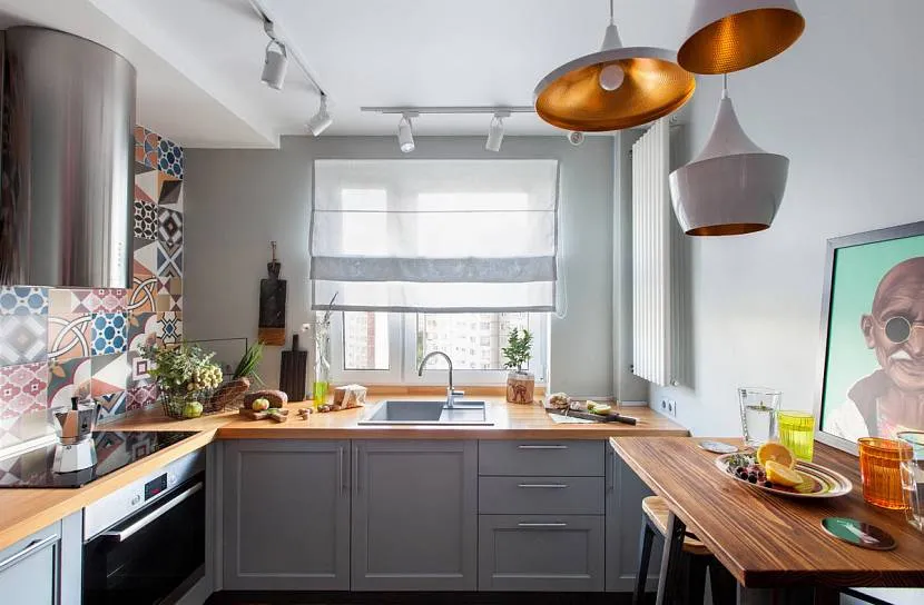 - Отсутствие необходимости выделять место на маленькой кухне для организации зоны приема пищи. Обеденный стол может стать более удобным и уютным, если использовать подвесные светильники для создания особого микроклимата.