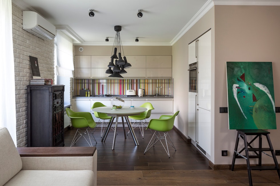 Еще один пример того, что ярким акцентом может выступить что угодно. В данном случае – это яркие зеленые стулья и очень необычная люстра, которая состоит из нескольких. А картина в этом интерьере играет далеко не последнюю роль.
