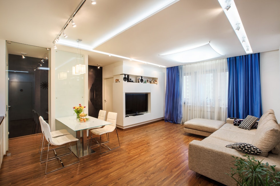 Светлая, просторная кухня-гостиная с ярким, освежающим элементом декора – шторами синего цвета. И это действительно потрясающее решение.