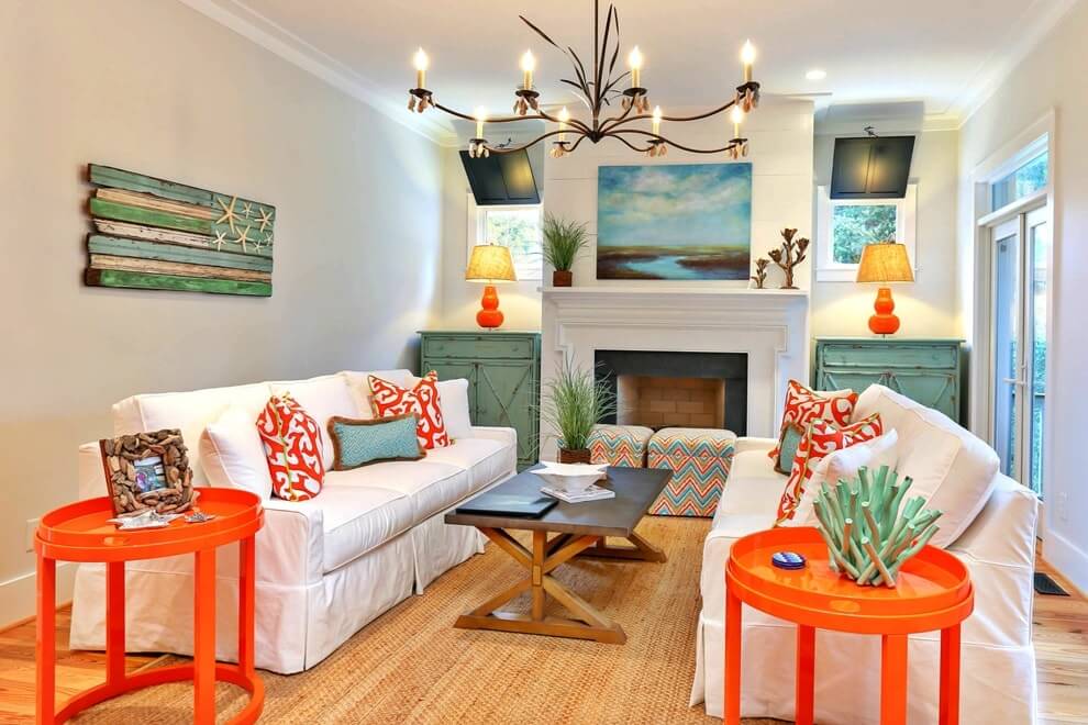 Коралловый диван соберет больше гостей, чем бежевый или серый.