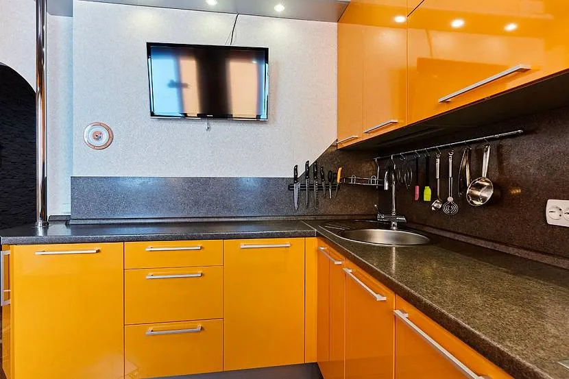 Главным украшением кухни является яркий солнечный тон гарнитура