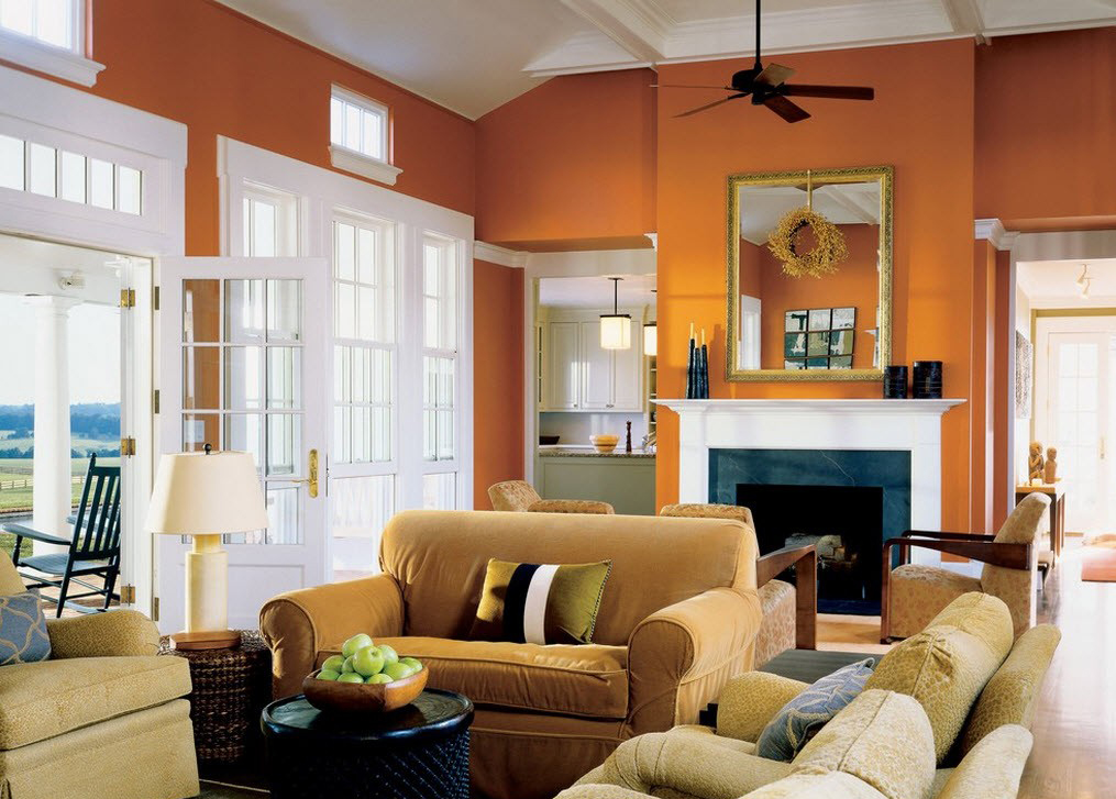 Если стены в комнате имеют оранжевый окрас, то автоматически подразумевается, что этот цвет основной и его больше 30%. Такую цветовую схему можно посоветовать тем людям, у которых окна выходят на северную (или тёмную) сторону дома. Если солнце не хочет идти к вам, то его принесёт дизайн!