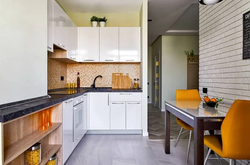 Благодаря тому, что плитка оранжевого цвета чередуется с белой, а сама кухня преимущественно белая, нет ощущения разрыва, резкого перехода. Белый цвет на полу и стенах соединяет всё помещение в общую композицию.