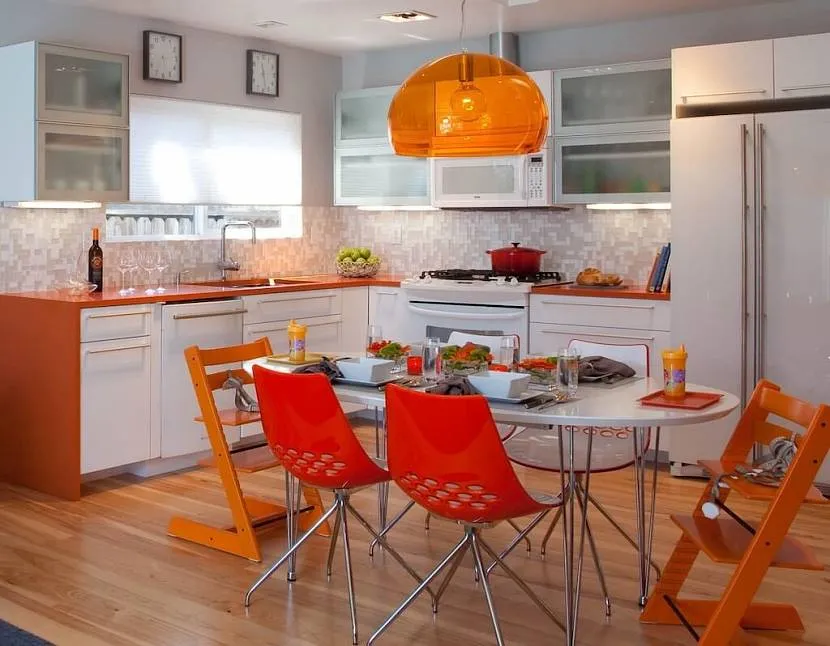 Белый цвет служит элементом фона, оранжевый представлен мебелью, элементами декора. Такое цветовое сочетание идеально подойдет, например, для минималистской кухни.