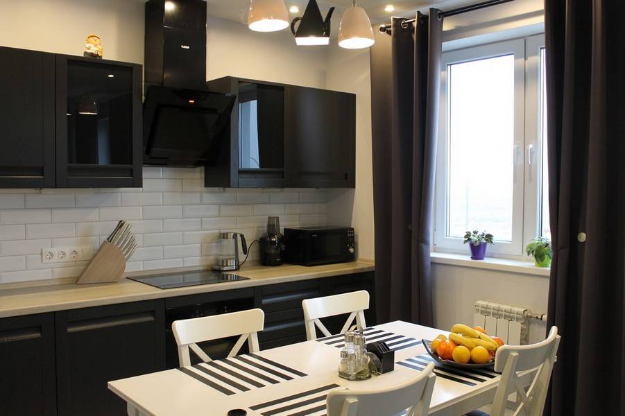 Компактная линейная кухня в стиле модерн имеет разделенную рабочую зону с двумя столешницами. В комплект входит высокий шкаф-пенал, модули для встраиваемой техники и остров, совмещенный с большим барным столом. Фасады темного дерева дополнены стеклянными дверцами верхнего ряда и открытыми полками. Навесные шкафчики – горизонтальные.