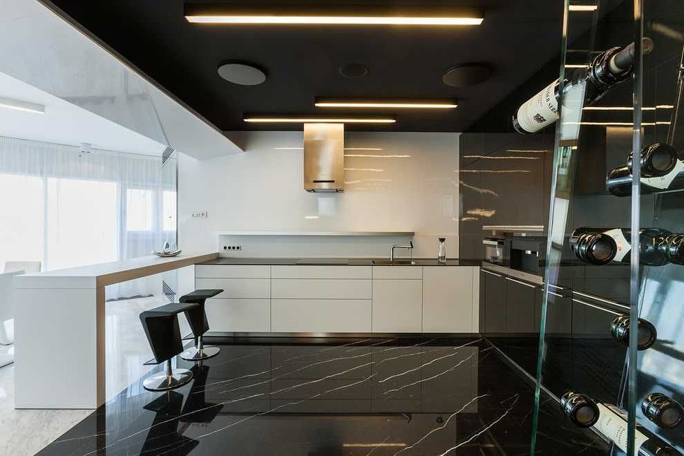 Кухня с чёрным потолком. В данном случае чёрный цвет помогает подчеркнуть зону кухни, ведь она совмещена с гостиной и дизайнер использовал визуальное зонирование, для разграничения пространства.