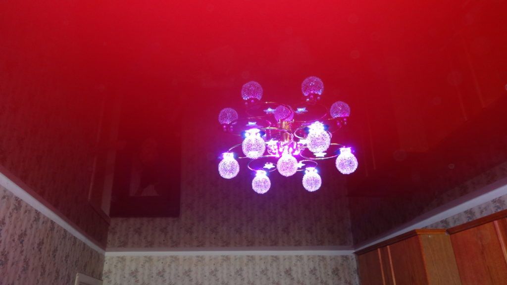 В глянцевом потолке отражается свет люстры, усиливая его и распространяя по всему помещению. Благодаря этому свойству, можно установить маломощные лампы и существенно экономить электроэнергию.