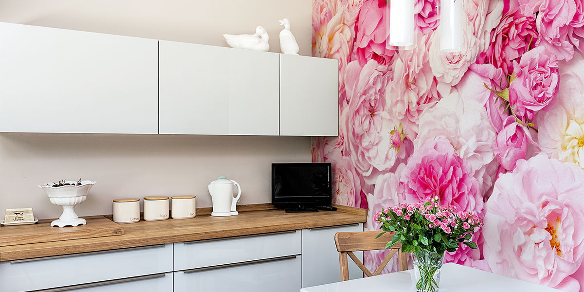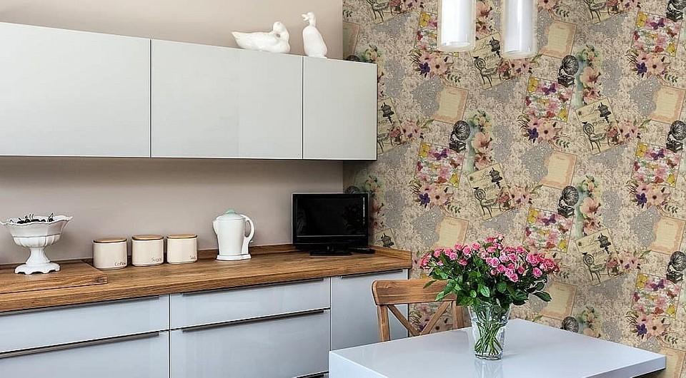 Для кухни в стиле прованс с белой мебелью прекрасно подойдут обои с изображениями лилий, лаванды, ирисов. В этом случае и остальной декор желательно выбирать тех же оттенков, что и цветы на обоях: кремового, сиреневого, фиолетового, небесно-голубого.