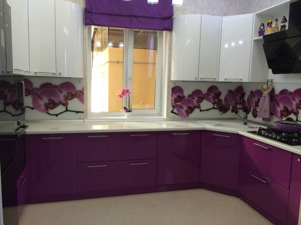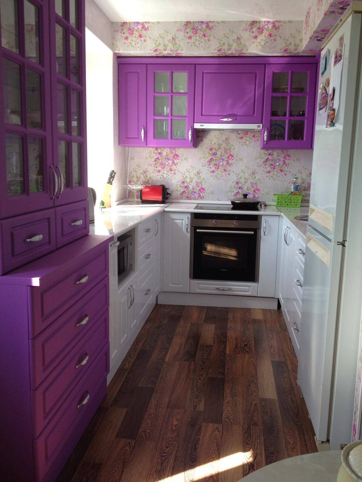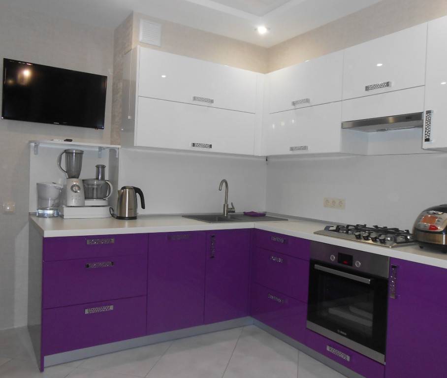 Чтобы оживить белую кухню и сделать ее более интересной, можно расставить цветовые акценты, используя фиолетовые, оранжевые и даже розовые цвета.