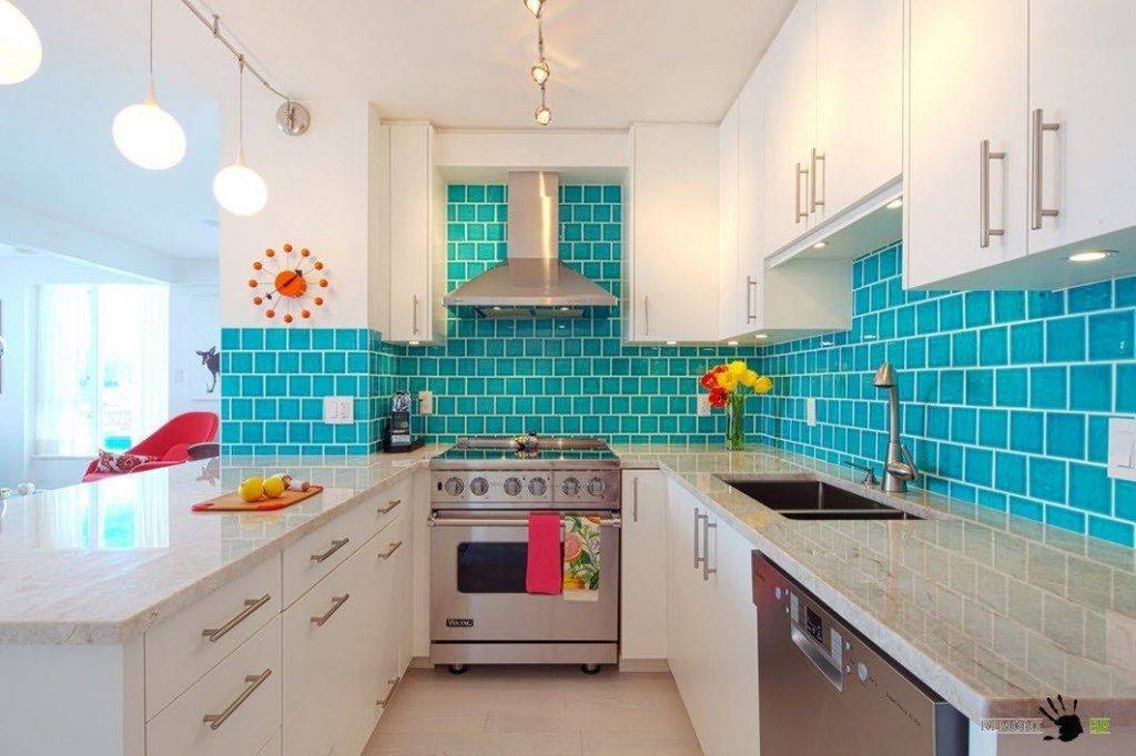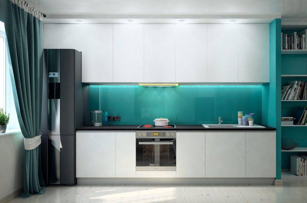 Если гарнитур имеет бирюзовые фасады, стеновые поверхности лучше оформить в белом цвете. С таким цветом мебели также хорошо гармонирует бежевая и серая отделка стен.
