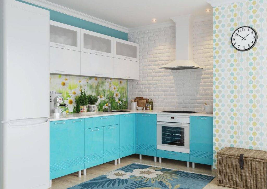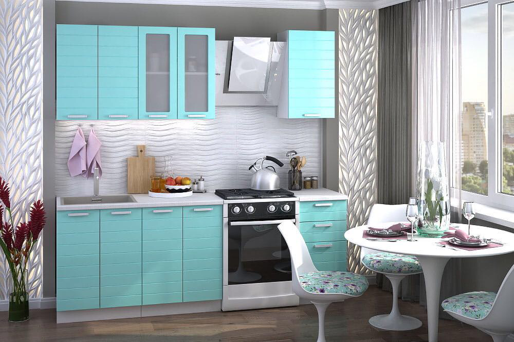 Презентабельно смотрятся гарнитуры с бирюзовыми фасадами. Они могут иметь глянцевое или матовое исполнение