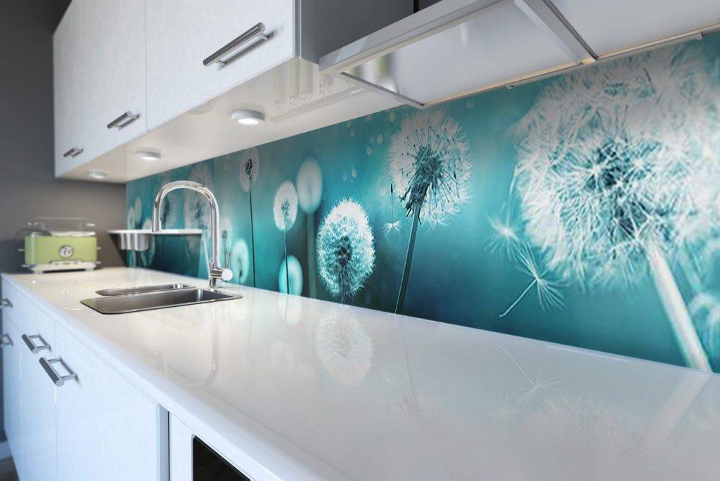 Блики будут перекликаться с хромированными поверхностями бытовой техники и декора. Отличный вариант для модерна – белый низ, бирюзовый верх кухни и однотонное белое окружение.
