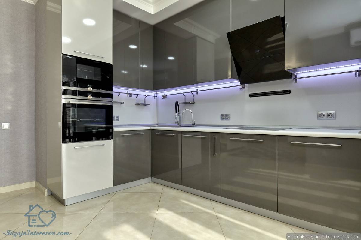 Серый глянец отлично подойдет для создания стиля минимализм. Светлые фасады позволят визуально увеличить площадь кухни. Цвет может использоваться в сочетании с другими оттенками, выгодно смотрится с графитом, черным, зеленым, синим или красным.