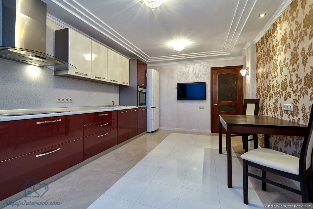 Бордовый цвет обладает свойством утяжелять предметы, делать их заметнее и визуально крупнее, поэтому важно избежать нагромождения предметов интерьера бордового цвета на потолке. В противном случае может создаться крайне неприятное ощущение давящих стен и визуальное уменьшение пространства кухни