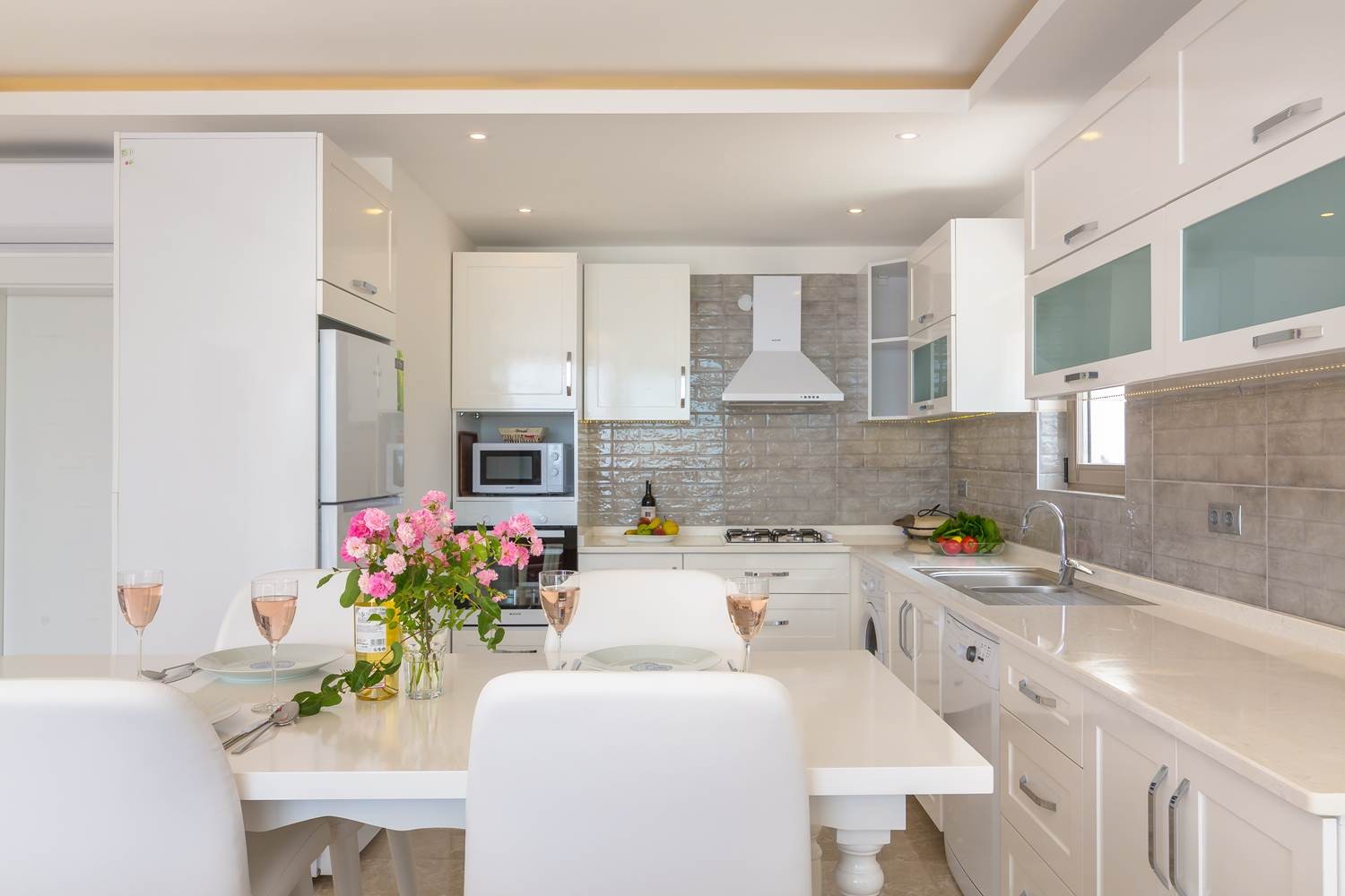 Сначала обратите внимание на то, что на кухне нет навесных шкафов, а только высокие напольные шкафы со встроенной техникой — даже вытяжка спрятана. Это все делает кухню еще просторнее, хотя проблем с площадью, как мы можем заметить, нет