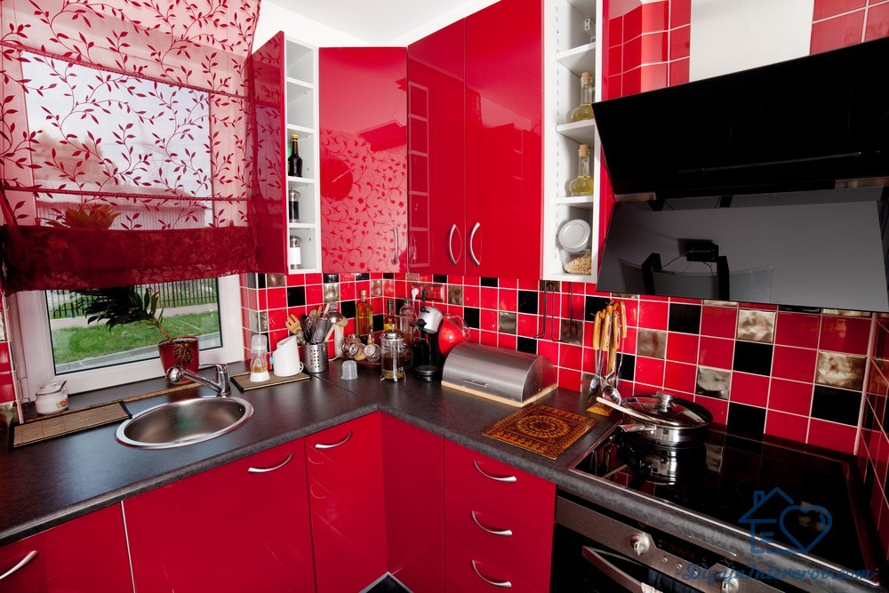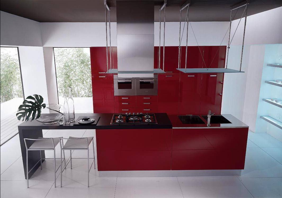 Экстравагантные смелые личности предпочтут яркую красную кухню. Броскость этого цвета будет увеличена вдвойне ярким блеском фасадов. Такое оформление нежелательно использоваться в маленьких помещениях, яркие цвета создают эффект нагромождения пространства.