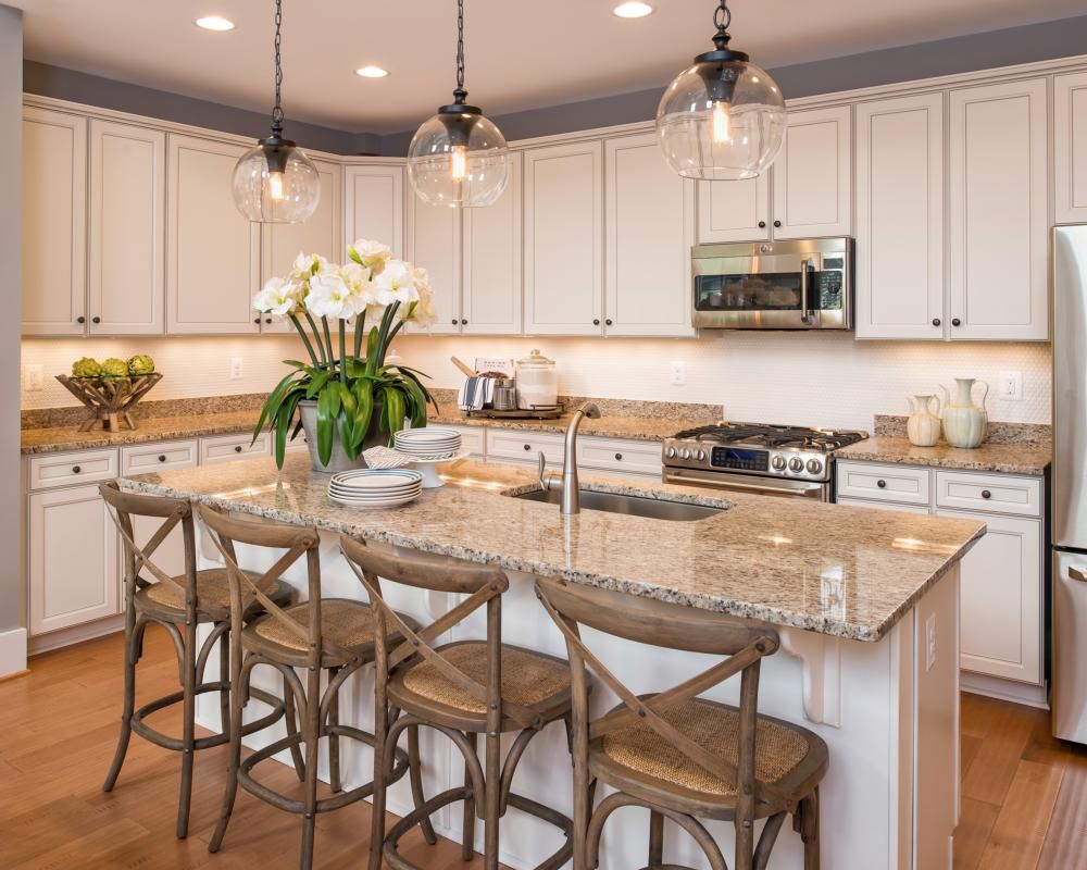 Также к такой кухне отлично подойдет столешница из натурального или искусственного камня, имитирующего мрамор: белый с серыми прожилками.
