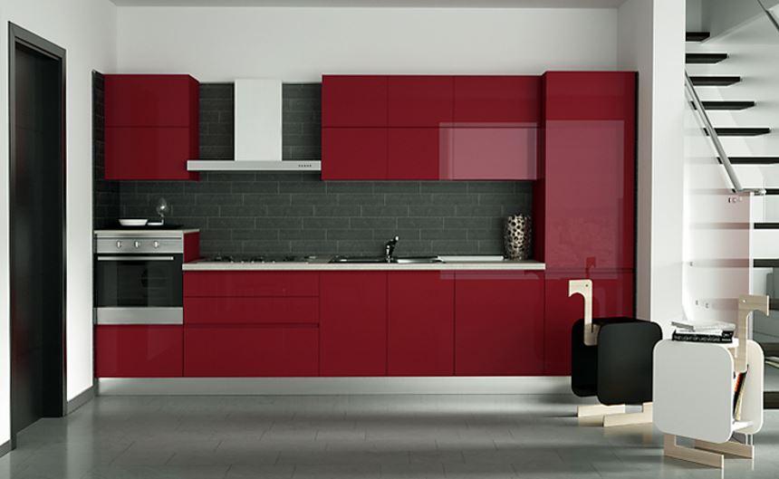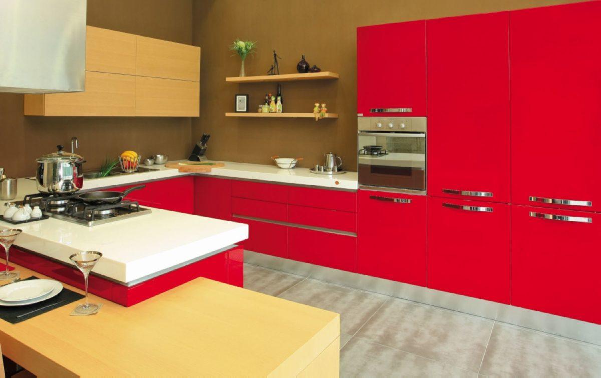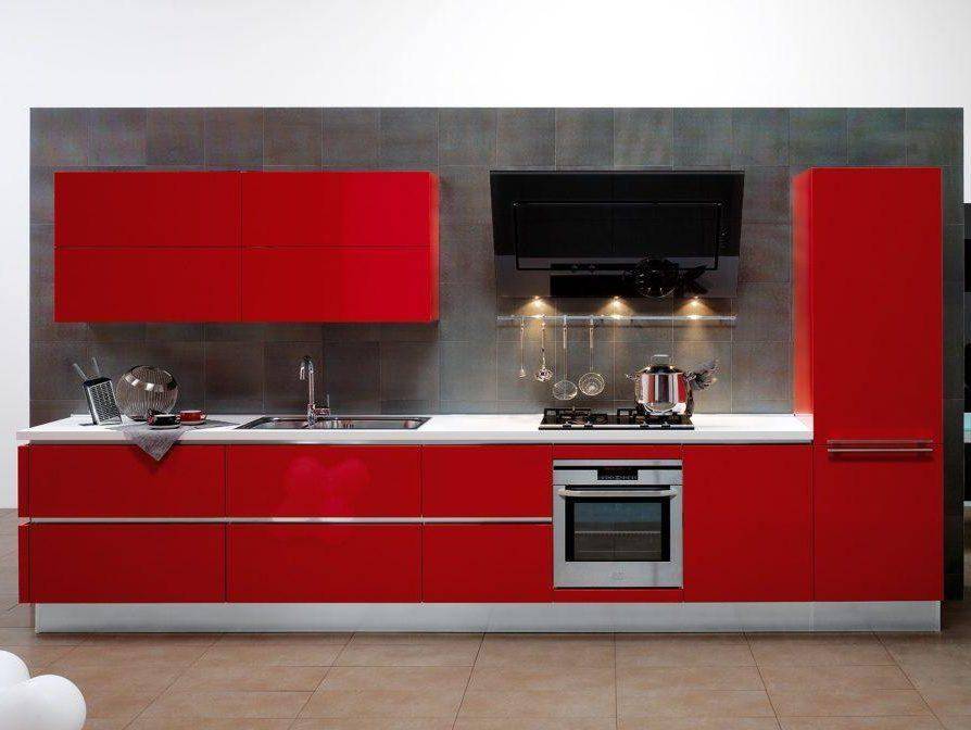 Красный кухонный гарнитур может иметь глянцевые или матовые фасады. Первые подходят для лаконичных современных интерьеров (особенно для стилей минимализм, хай-тек, поп-арт). Поскольку они отражают много света, они будут уместны на малогабаритной или плохо освещённой кухне.