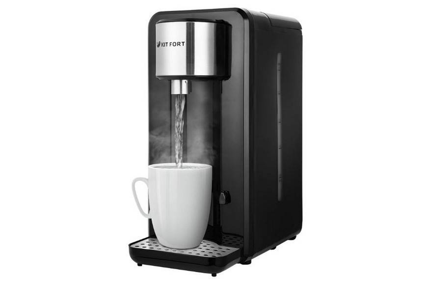Такая модель внешне больше похожа на кофемашину, чем на термопот. Из недостатков для среднего ценового диапазона можно выделить небольшой объём – 2,5 литра и только один режим температуры – 98 градусов Цельсия. Однако мощность такого чайника составляет 2600 Ватт: даже полный объём жидкости закипает менее чем за 10 минут.