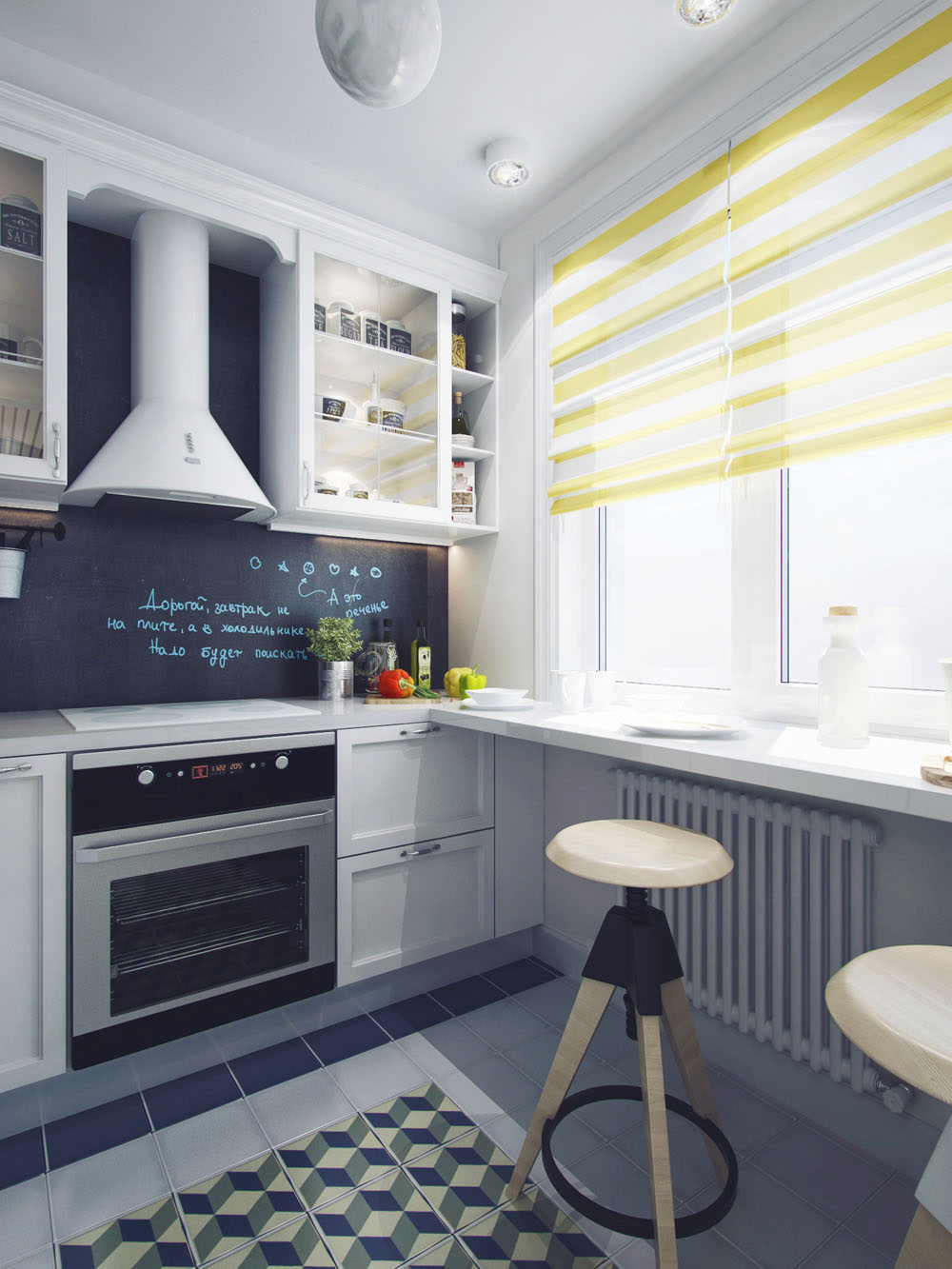 Главным декоративным элементом на кухне выступает фартук, поэтому акцентировать внимание можно на нем. К тому же он сделает ярче и веселее однотонный кухонный гарнитур