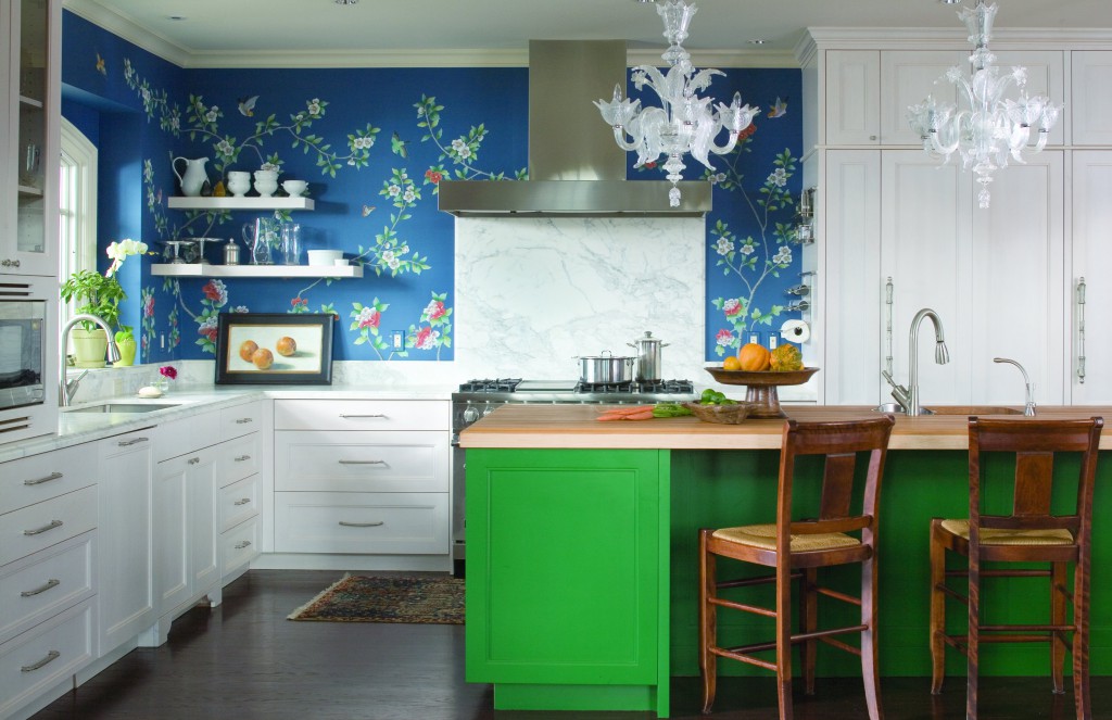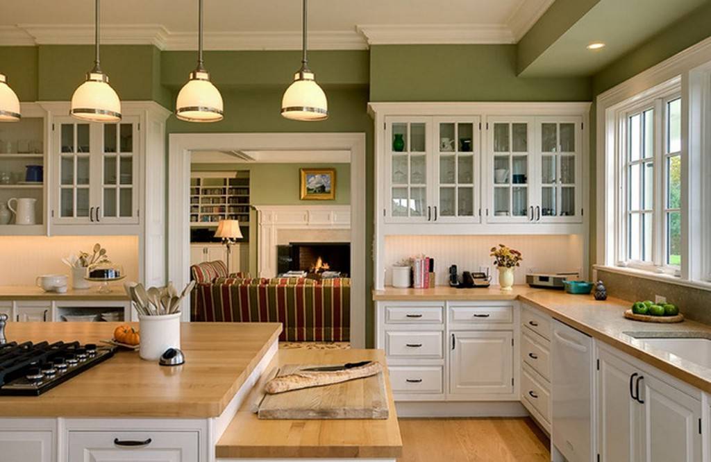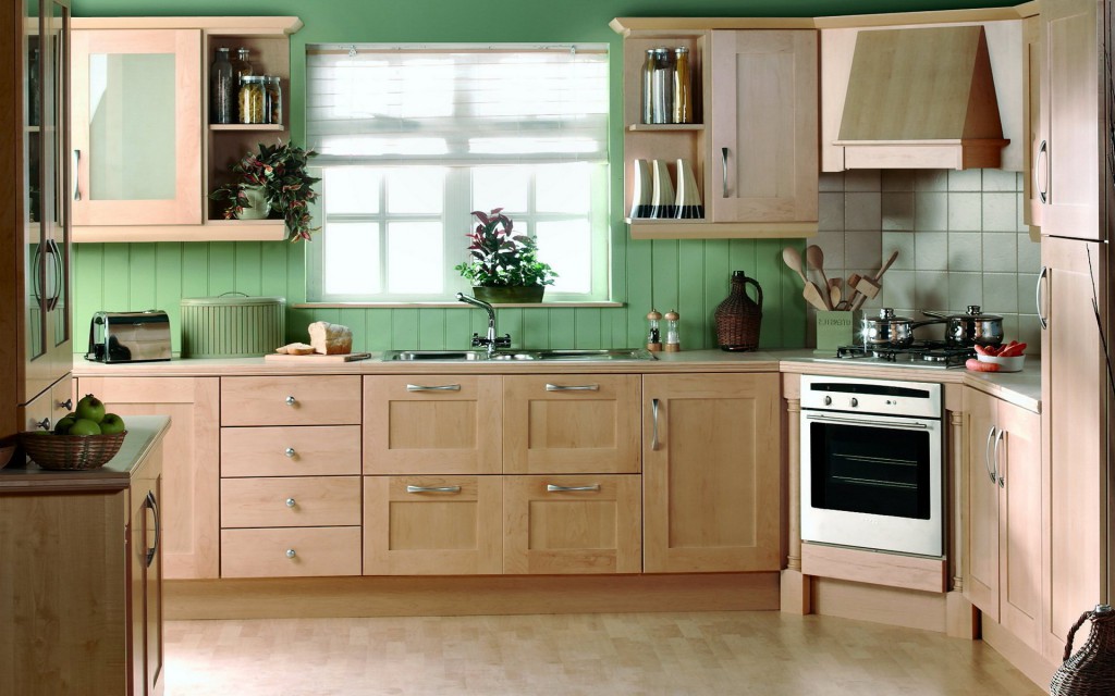 Природные тепло-оливковые и позитивные салатовые тона идеально комбинируются с бежевым, не раздражают и не утяжеляют кухню. Использование зеленых обоев или другой отделки придает обстановке бодрый, свежий и экспрессивный вид.