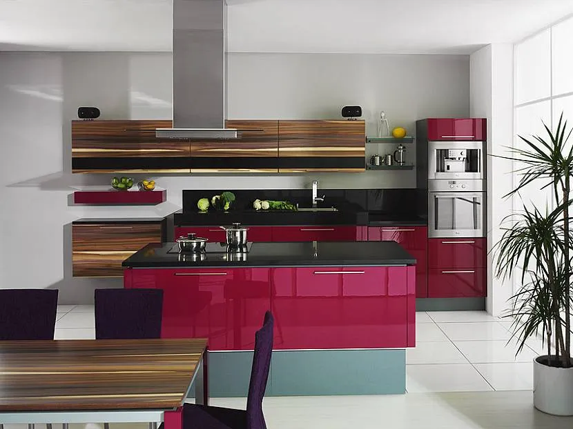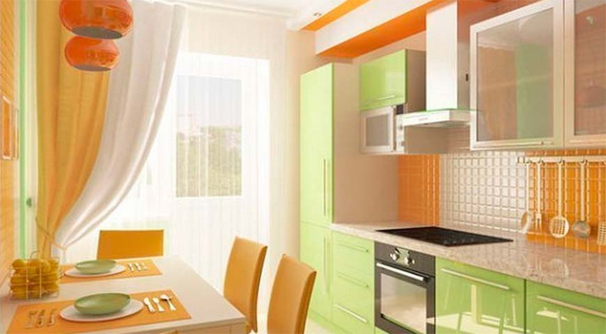 Для придания оригинальности дизайну кухни можно выбрать кухонный гарнитур яркого цвета, контрастного окраске стен и потолка. Гарнитур желательно сочетать по цвету со шторами и различными деталями интерьера.