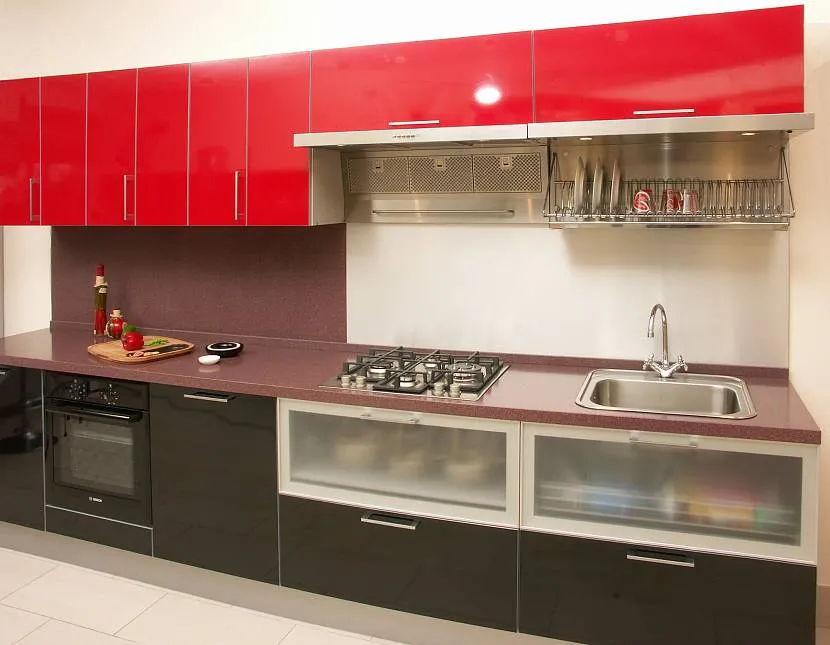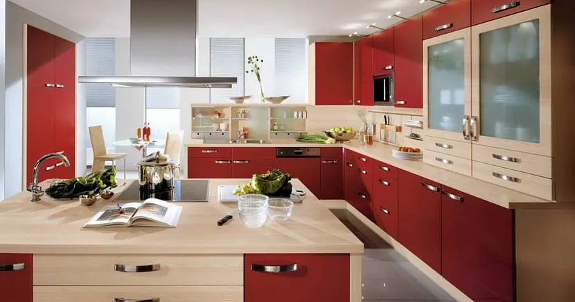 Столешница на красной кухне подбирается таким образом, чтобы сбалансировать яркость красок