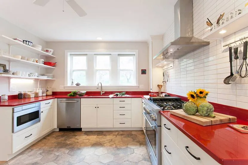 Белая кухня с красной столешницейИсточник www.houzz.es