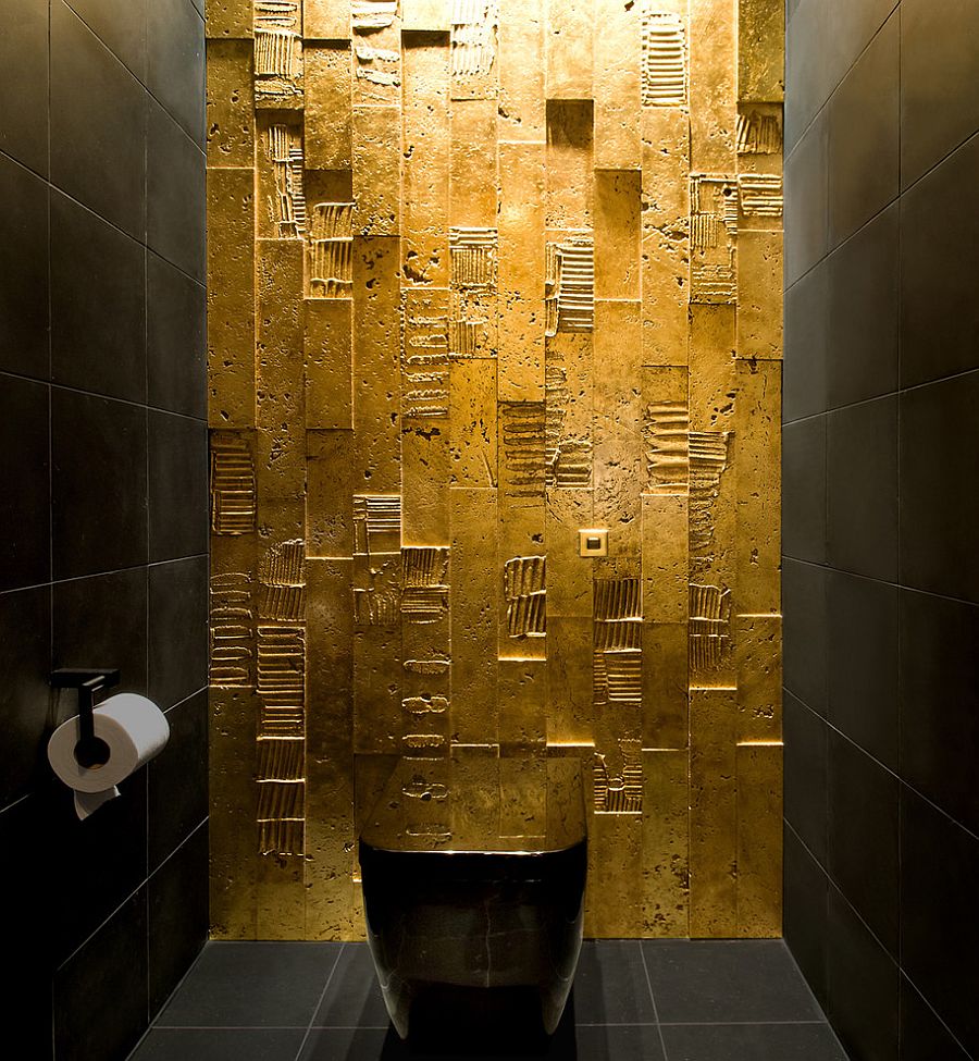 Хотя золото-чёрный не может быть главным сочетанием в гостиной или спальне, но, дизайн с использованием этих цветов в современной ванной комнат, может вскружить голову любому человеку. Тёмная ванная комната вызывает образы достатка, золото представляется в виде глазури на торте.