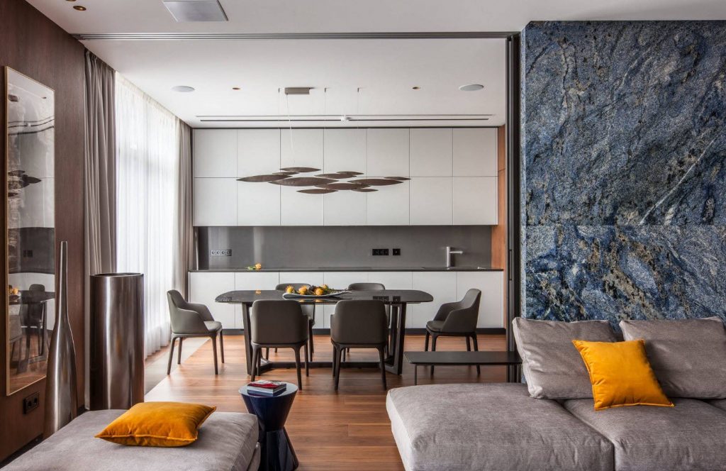 Синие отливы могут стать дополнением белого, молочного, серого. Не стоит выбирать темные оттенки в качестве фоновых, лучше добавьте синие нотки в текстиле, мебели на кухне.