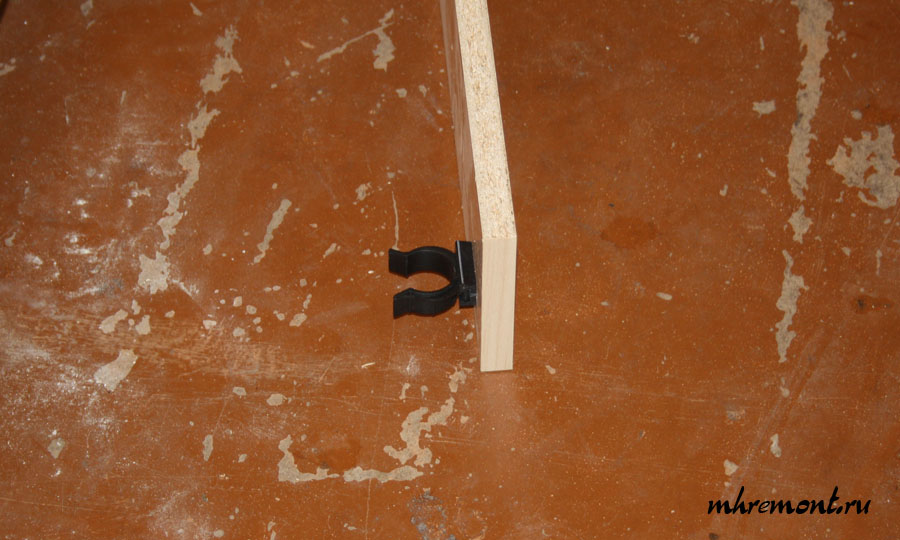 - С внутренней стороны пластиковая и алюминиевая дощечки имеют специальные зазоры, в которые на нужном расстоянии вставляются клипсы. К цоколю из ДСП крепления прикручиваются саморезами с небольшими шляпками. Когда клипсы будут расположены на нужном расстоянии, их нужно просто защёлкнуть за ножкой шкафа.