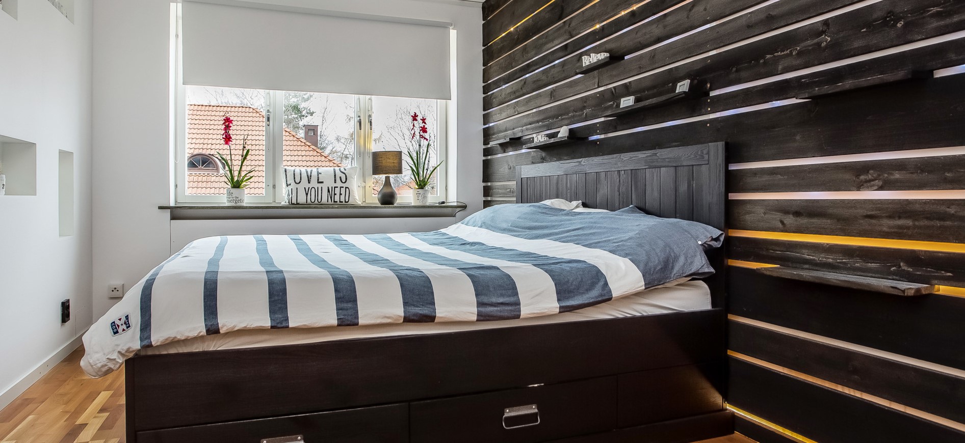 С помощью экопанелей можно оформить прикроватную зону в спальне