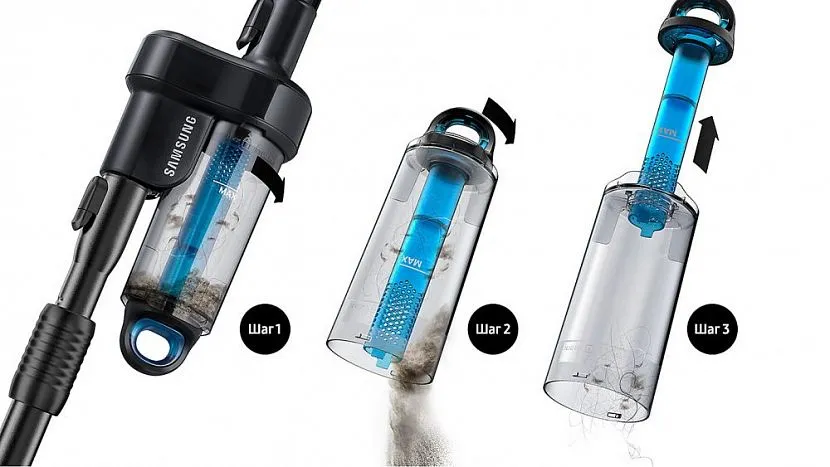 - поддержание постоянной мощности всасывания. Приборы, оснащенные мешками для сбора пыли, при забивании последнего имеют обыкновение существенно терять силу забора воздуха. Поскольку в циклонных пылесосах Самсунг с фильтром на ручке или иных других моделях на пути воздушного потока не существует преград, то мощность остается неизменной;