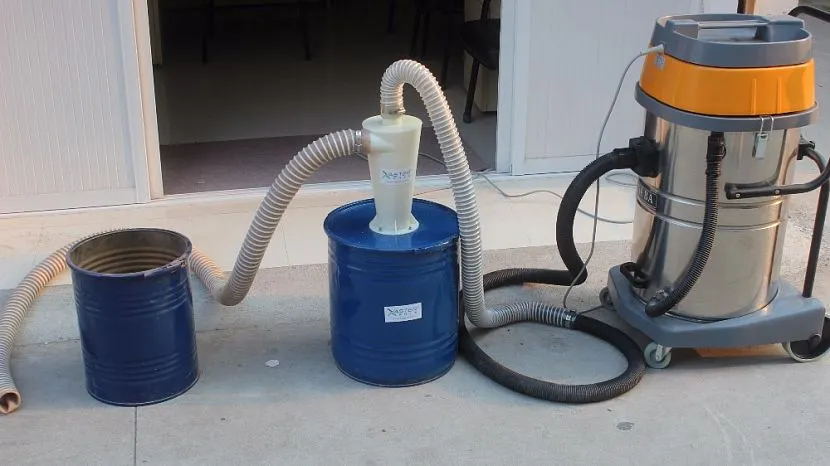Если оборудуется пылесос, например, для гаража или столярного цеха, то лучше использовать металлическое ведро. Его нужно герметически закрыть, проделав два отверстия. К одному будет подключаться пылесос, к другому — шланг, который предназначен для поступления смеси воздуха, пыли и мусора.