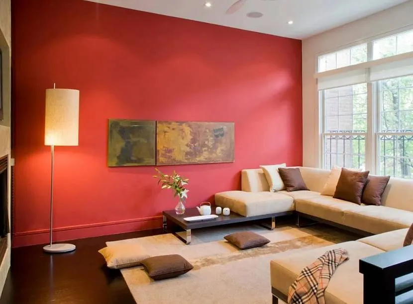 - Можно окрасить одну стену ярким и насыщенным цветом. В особенности такой контраст будет заметен в гостиной, оформленной в бежевом, сером, белом и других светлых тонах. Использование яркого цвета поможет визуально разделить комнату на зоны.