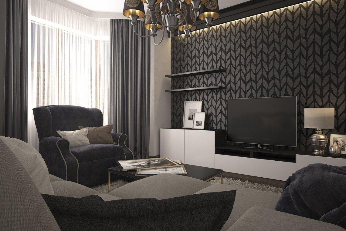 Темные тона уместны в просторном помещении, а стены в маленькой гостиной лучше оклеить светло-серыми шпалерами.