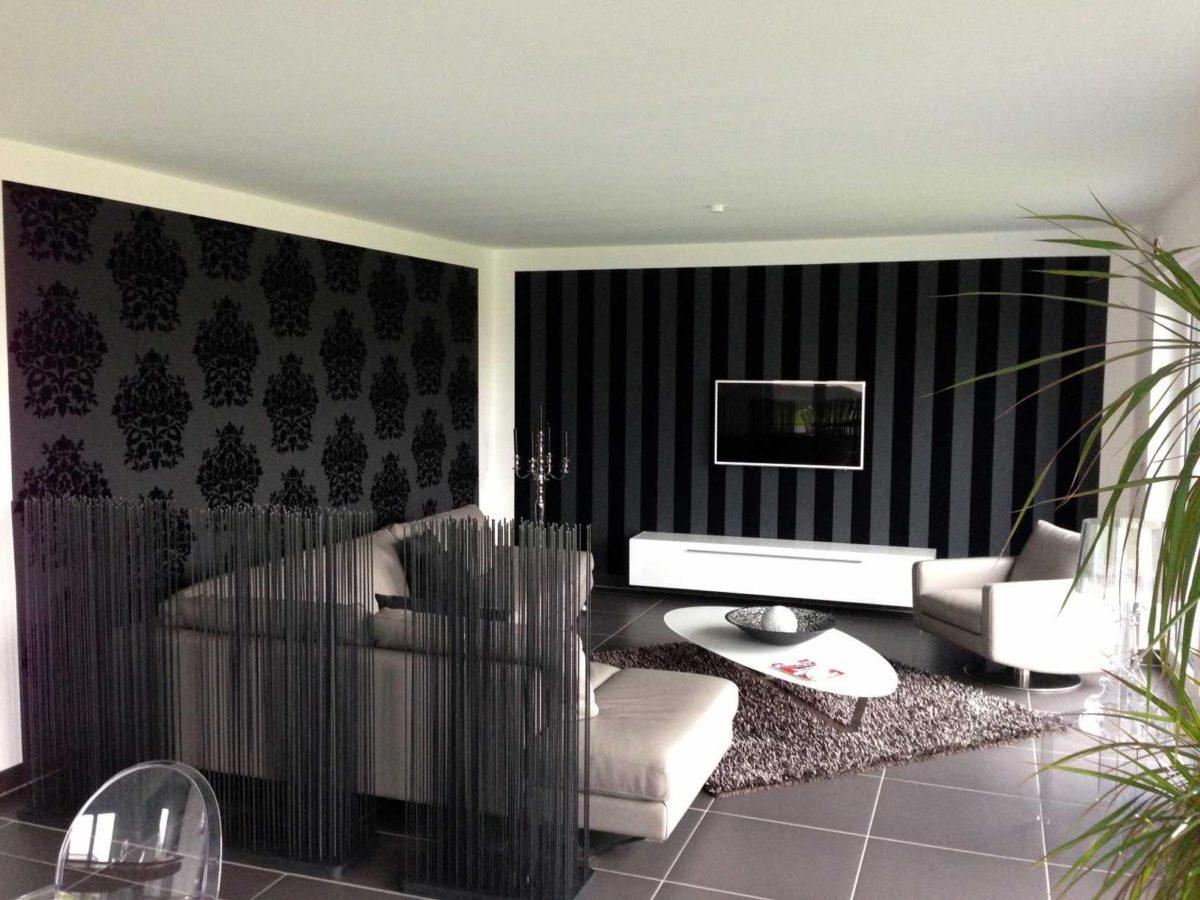 Традиционный и наиболее простой вариант – сочетание черных и белых оттенков в интерьере. Это могут быть обои, наклеенные на единую поверхность, обои и мебель или сочетания настенных покрытий и текстиля.
