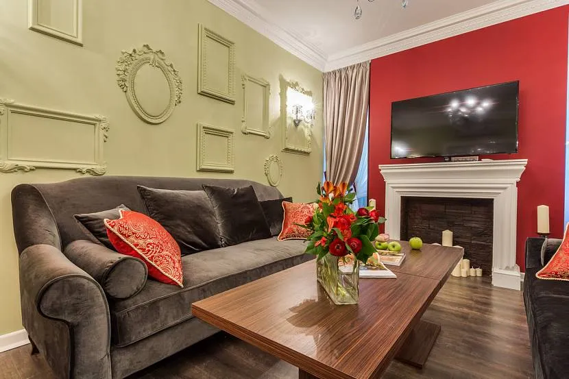 Красный диван на фоне бордовых стен гостинойИсточник vsaunu777.ru