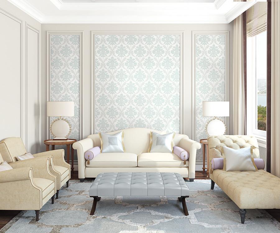 Украшением гостиной может стать участок стены, оклеенный обоями, отличающимися по цвету, узору или фактуре.