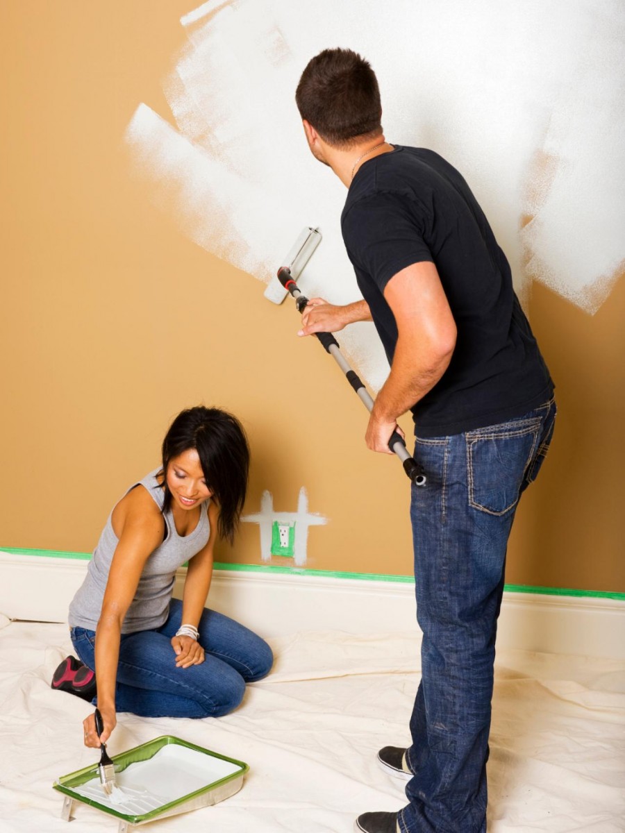 Для лучшего качества покраски перед ее началом необходимо временно демонтировать все выключатели и розетки и по возможности радиаторы отопления. Мебель желательно вынести или перенести в середину комнаты и накрыть строительной пленкой, защитив тем самым от брызг краски.
