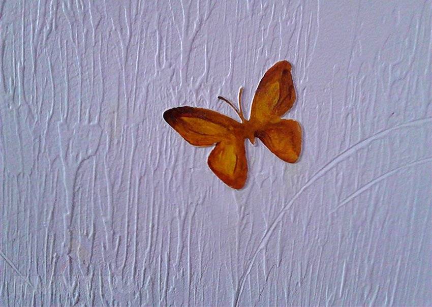 Для этого способа нанесения подойдет любая мелкозернистая декоративная штукатурка или обычная шпатлевка. Наносится первый слой и аккуратно разравнивается, достаточно толщины 2-3 мм. После подсыхания, рельеф наносится щеткой, смоченной в воде: