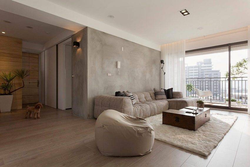 Как смотрится декоративная штукатурка под бетон в интерьере кухни-гостиной-столовой — в фотогалерее ниже: