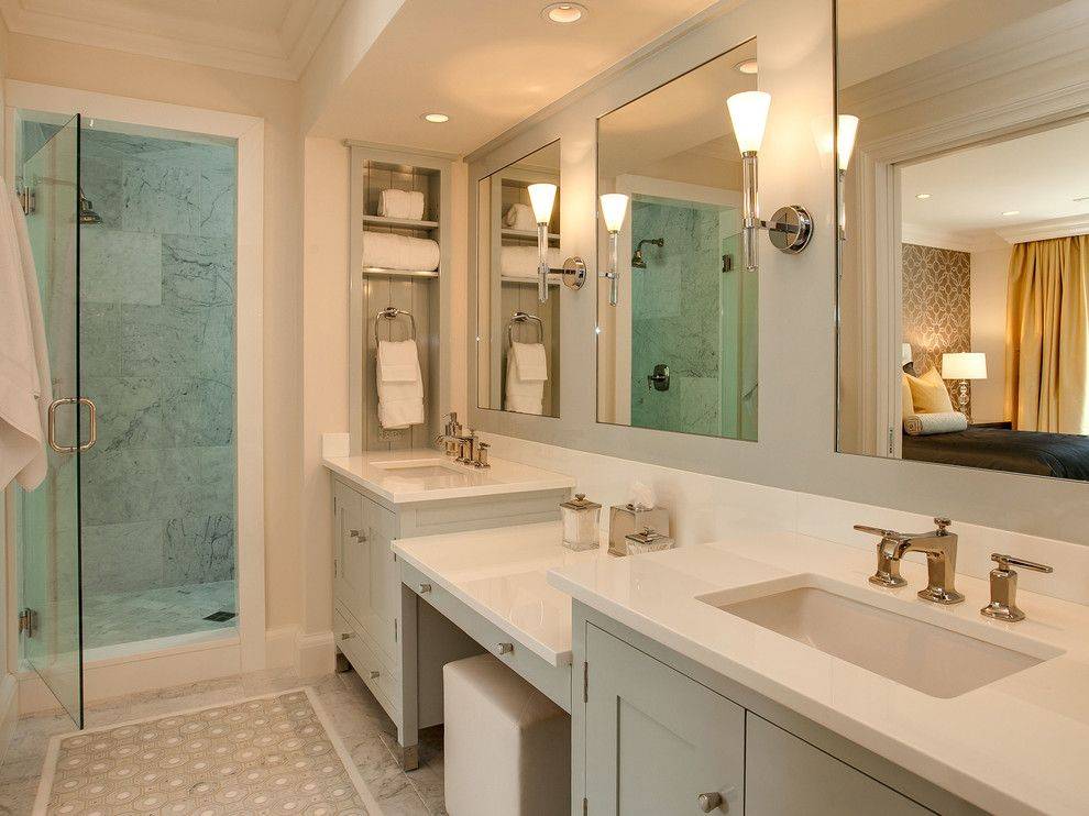 - В интерьере комнаты личной гигиены нет окна и можно оформить фальшстену из гипсокартона. Ее глубина, размеры и количество проемов зависят от индивидуальных предпочтений.
