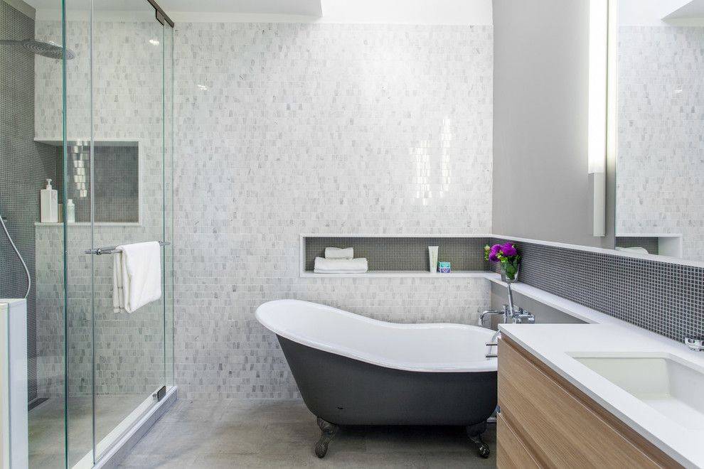 - Если ванная комната совмещена с туалетом, то для оформления углубления прекрасно подойдет пустующее местечко за сливным бочком.