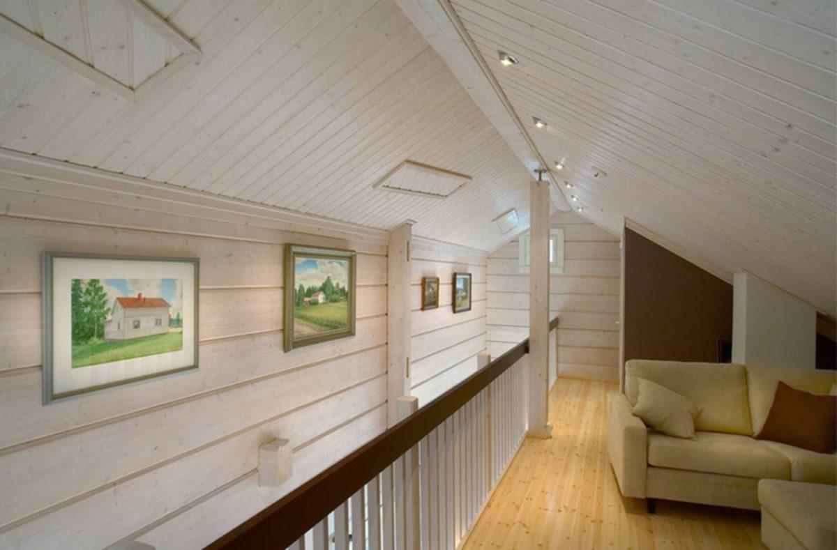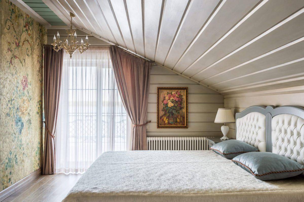 - В качестве отделки элементов потолка частного дома вагонка подходит великолепно. Дизайнеры рекомендуют уделять больше внимания мансарде и даже делать на ней акцент. Например, стены в помещении оклеить обоями, а мансардную часть потолка обшить вагонкой подходящей расцветки. Сам по себе такой дизайн является необычным, поэтому его не стоит «нагружать» слишком яркой палитрой.