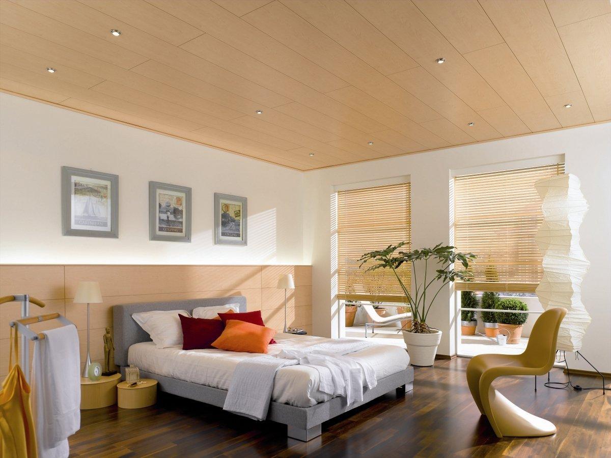 Очень удачно в спальне смотрится гипсокартон, панели МДФ, фактурная потолочная плитка, натяжные потолки.