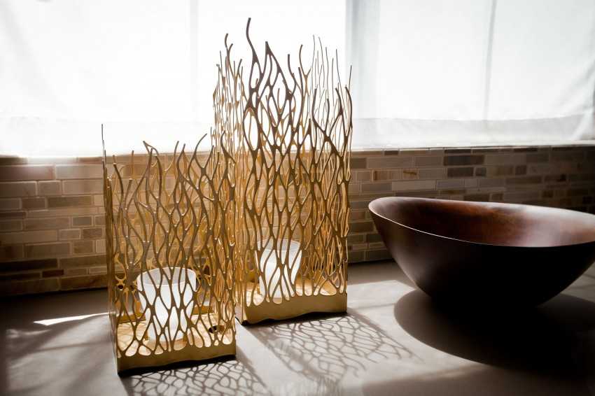 - Расставив несколько ваз с густым набором ветвей, можно создать подобие натуральной ширмы. Ее в свою очередь можно красиво украсить лампочками, цветами, шариками либо разрисовать красками.