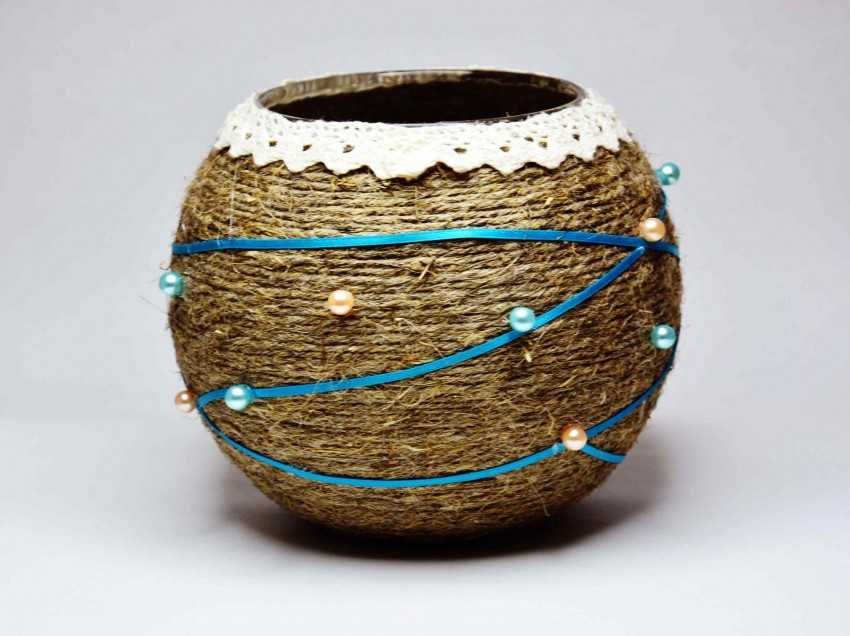 Самый простой и бюджетный вариант материала для создания напольных ваз — это бечевка. Такой материал так же называется пальмовым волокном и есть он практически на каждом участке.