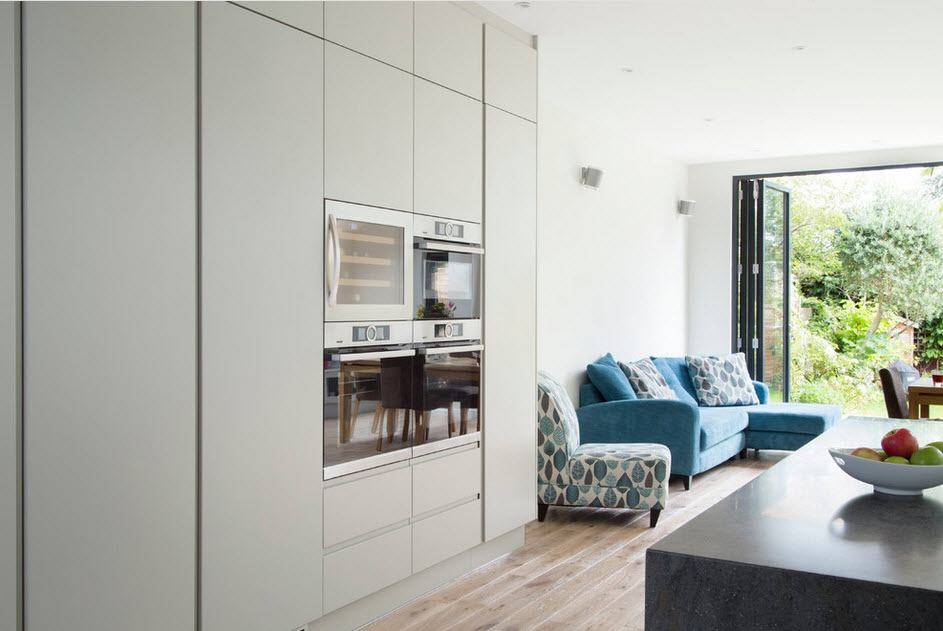 В большом помещении кухни можно и вовсе использовать практически любой вариант, ведь диванчик можно поставить максимально далеко от рабочей зоны и не переживать, что на него попадут брызги от масла или другой еды. В любом интерьере кухни будет красива и универсальна мебель в пастельных оттенках.